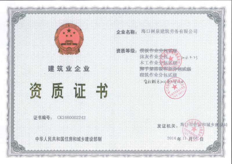 海口樹泉建筑勞務有限公司成立于2011年,公司位于海口,其前身是一家專業建筑施工隊,自2004年即開始在海南從事建筑勞務施工。自成立至今,公司已經擁有一支科學管理、質量過硬、能打硬仗,搶工期的專業隊伍。能獨立承擔大中型工業與民用建筑 、室內外裝修、各類機電設備安裝工程。代表工程有海口濱海華庭、三亞時代海岸T01/02/04/05棟高層、合肥東海花園二期、陵水富力灣B區高層、三亞金中海(酒店)、瓊海大印經典花園、海口環(huán)球海景大酒店(四星級酒店,在建中)、陵水珍珠大廈(五星酒店)、海口萬達廣場、美蘭機場二期。